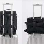 スーツケースのハンドル部にバッグ本体をかませることも可能。バッグ縦方向時はチェストロックベルトで、横方向時はクッションパッドとバッグ本体の間にある空間を通すことで、スーツケースにセットアップ。