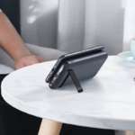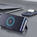 本体側面には、バッテリー残量をパーセンテージで表示する液晶ディスプレイと、ワイヤレス充電専用のインジケーターを搭載。充電は、デスクの上に平置きするスタイルだけでなく、自立スタンド搭載により角度を付けてスマホを設置できます。
