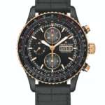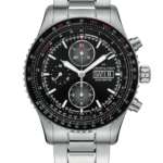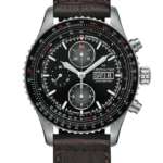 「Khaki Aviation Converter Auto Chrono/カーキ アビエーション コンバーター オートクロノ」(23万6000円〜/税別)は、9時位置に配置されたスモールセコンドをマットブラックのダイヤルと同系色のブラックに、12時位置の30分積算計と6時位置の12時間積算計をグレーでカラーリングし、モダンな印象に。3時位置には、デイデイト表示も配置しています。
