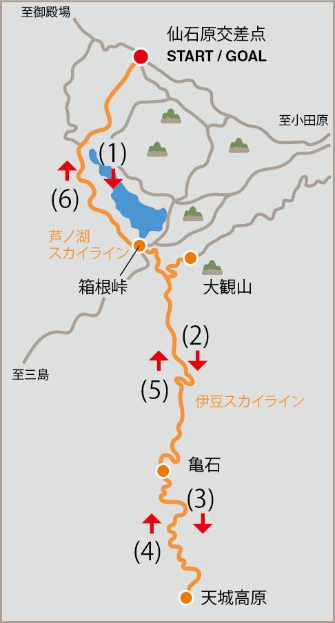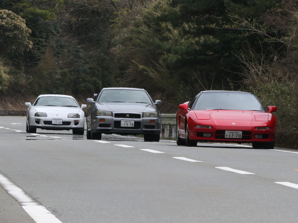 車両はスープラ(JZA80)、NSX(NA1)、GT-R(BNR34)の三車種。コースは、箱根仙石原をスタートし芦ノ湖スカイラインを抜けて伊豆スカイラインを往復する約150km。コース内を6区間に分け、ペア三組6名が順次各車両を乗り換えてツーリングする。もちろん一人で参加することもできる。