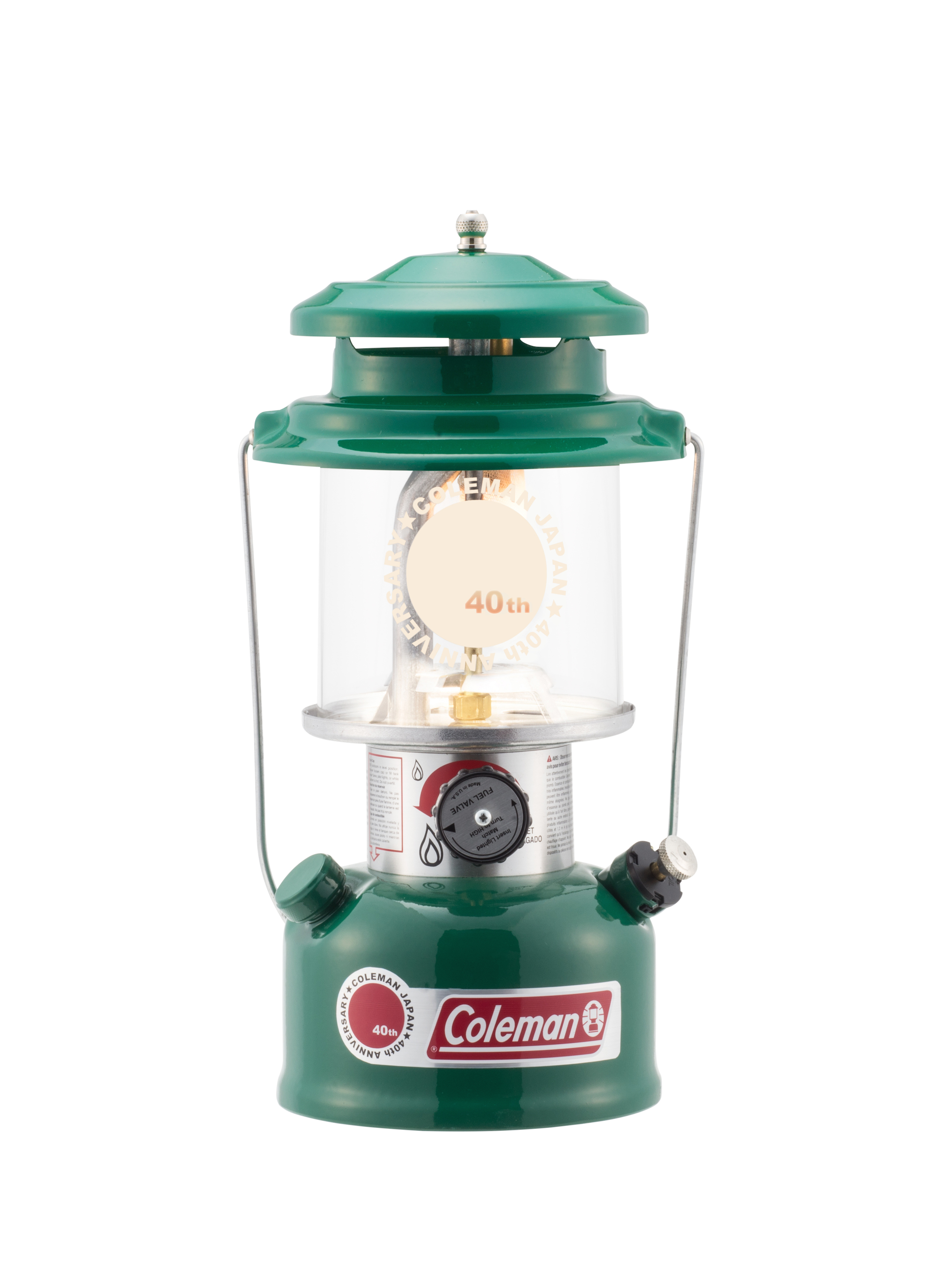 ガラスのグローブを 40 周年スペシャルデザインに変えて登場。夜のキャンプシーンに必須の、ホワイトガソリンを使用する明るいランタン。こちらも、ライムグリーンを採用した“Made in USA”の製品。