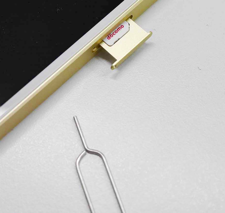 iPhone SEに付属のピンを使ってカードスロットをオープン。OCNのSIMカードを載せて入れるだけでOK