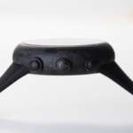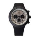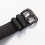 ケースバックやりゅうず、プッシュボタンといったメタルパーツには、純チタニウムよりも高い硬度を備えたグレード5チタニウムを採用し、ブラックPVD仕上げでケースとの一体感を演出。
