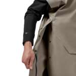 さらに、この生地に水鳥の羽根から着想を得た、環境に優しい「エコレペル」コーティングを施し、防水性を高めています。フードをかぶり、止水ファスナーを首元まで閉めれば防寒・防水対策も万全。サイドのスナップボタンを開閉することでジャケット内部の温度調節も可能です。