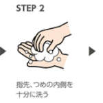 (1)よく泡立ててから両手のひらとこうをこすり洗い。こうを見落とさないで。