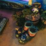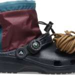 ショートゲイターが付いたブーツのようなクロッグは、登山やキャンプで実際に使うことが想定されたデザイン。左足には暗い道を照らすライトや小物を収納できるポーチ、右足にはロープの束、コンパス、バンジーコードなどを装備しています。
