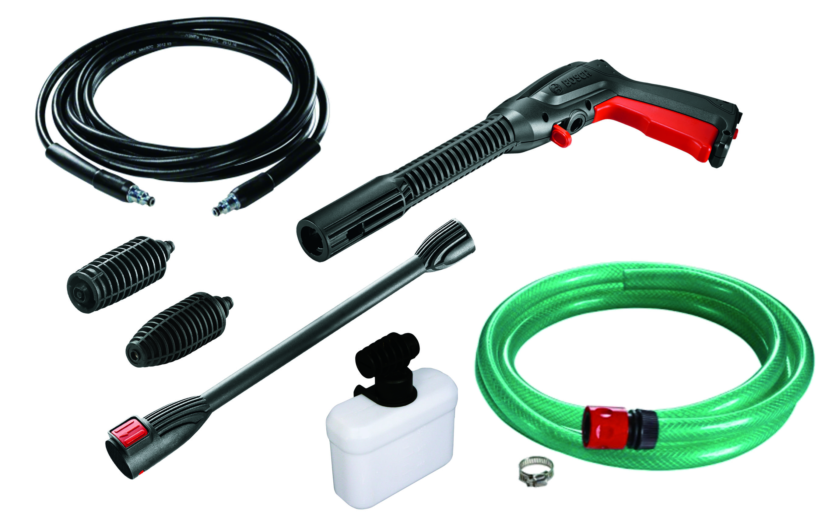 本体はH293×W385×D165mmで3.8㎏と小型軽量サイズ。動力源は電力で、水道にホースで接続して使用する。本体には、各ノズルやホースなどの7種類の付属アクセサリー一式が標準装備されており、何かを買い足す必要なく、購入後そのまま使えるようになっている。