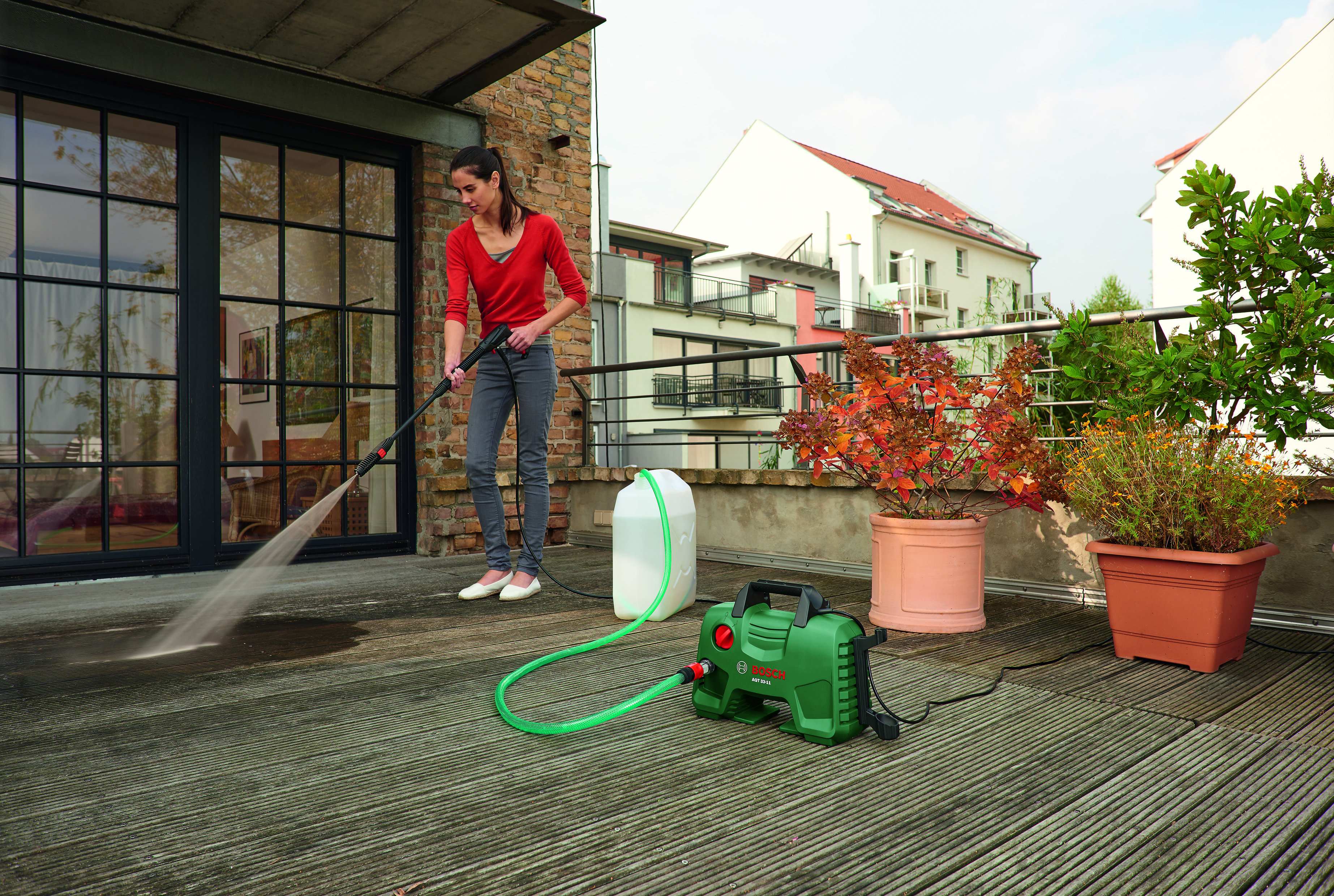 使用できるのは水や40℃までのお湯。付属品の「フォームノズル」で、洗剤を細かい泡にして一緒に噴射することもできる。また、別売りの自吸用ホースセットを使えば、水道からホースで接続しなくてもバケツやため池などから自動で水を吸い上げて利用することも可能だ。