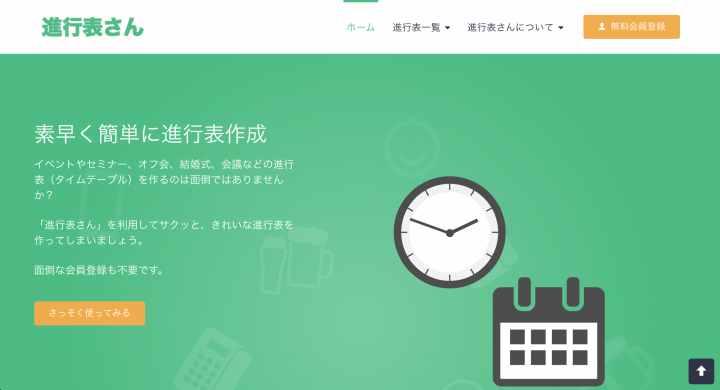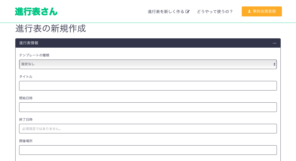 このサービスは、会員登録なしで最低限の機能が利用可能。まず、「進行表さん」のサイト(https://shinkohyo.com)にアクセスし、タイトルや開始日時などの情報を入力します。
