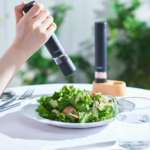 「電動ミル ソルト&ペッパー ミニ」は、上部のボタンを押すだけで胡椒や塩を挽けるので、料理の手を休めずに片手で使用できるのが、手動のミルとの差です。