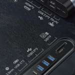 17個のポートは本体の前後に配置され、ケーブルを抜き差ししやすいように設計されています。そのうち、USBポートは5つ、3つがUSB 3.0ポート、残りのふたつがUSB 2.0ポートです。伝送スピードが最大5GbpsのUSB 3.0ポートを使えば、外付けハードディスク内の動画など大容量データの編集作業もノートPCで快適に行えます。