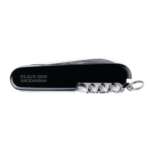 搭載されているツールはラージ&スモールブレイド、栓抜き、缶切り、マイナスドライバーなど、使用頻度の高いものを中心とした全15種類。長さ91×幅27×厚み21mm、重さは約97gと扱いやすいサイズ。ツールは堅牢性を備えたステンレススチール製、持ち手はセリドール樹脂製(カラーはブラックのみ)となっています。