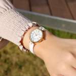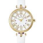 時計の要となるリューズ、ラグにはスワロフスキー・クリスタルを使用され、聖闘士を照らすアテナのように、太陽で充電するソラームーブメントが採用されています。白いカーフレザーの裏側は、アテナの髪を表現したパープルで、エレガントさを醸し出しています。