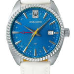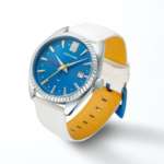 革ベルトの内側にはイエローを配置することにより、さりげなく氷河のイメージカラーが再現されており、12時の位置にはキグナスなレリーフを配置。母国を愛する氷河に相応しい、ふたつの時間を表示するGMT機能付きとなっています。
