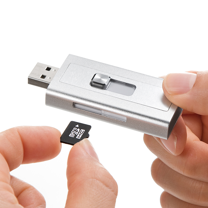 USB経由でPCに接続すればパソコン用のカードリーダーとしても使用可能だし、microSDカード対応のAndroid端末に、iPhoneやiPad、パソコンのデータを転送・閲覧することもできる。
