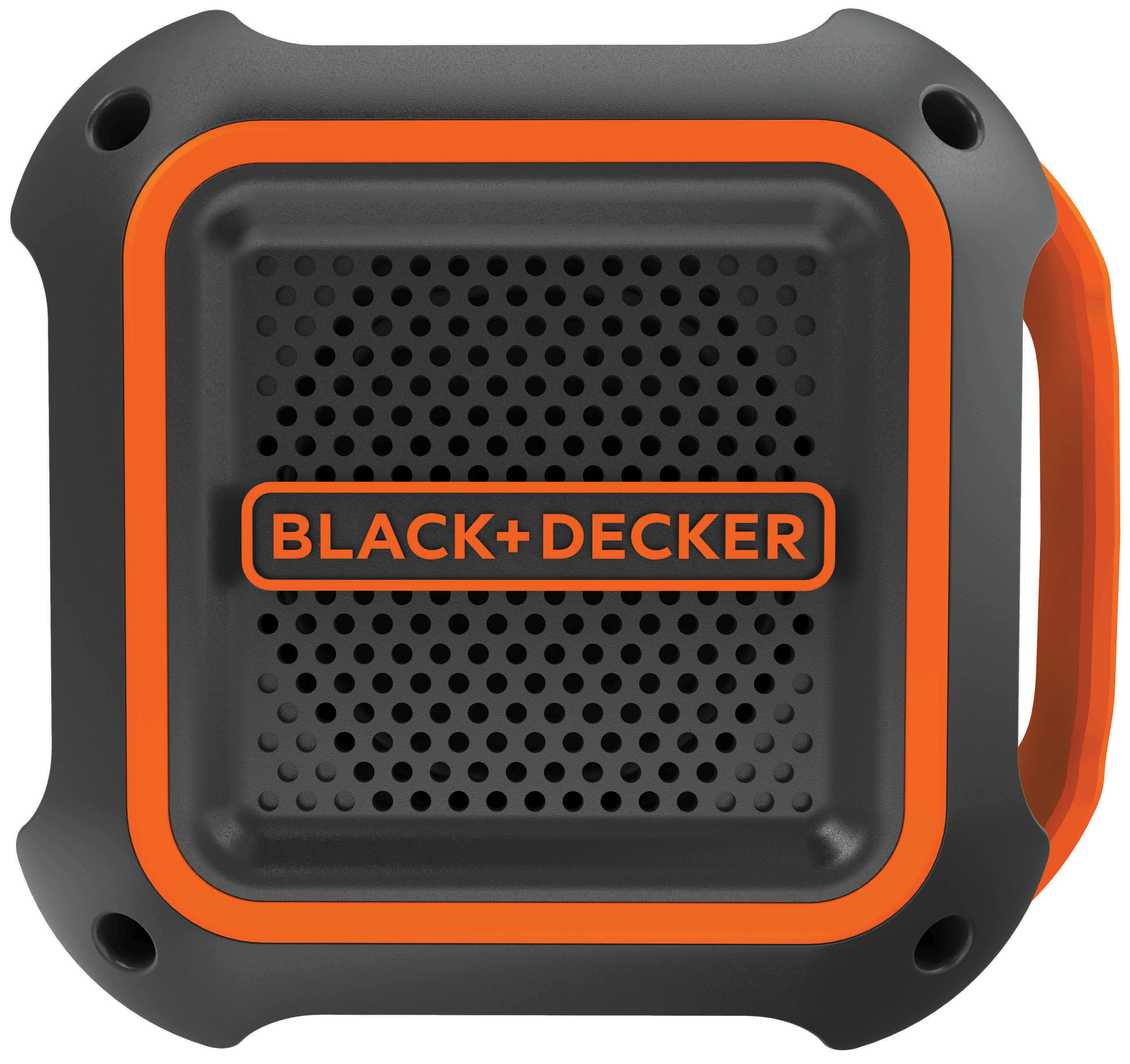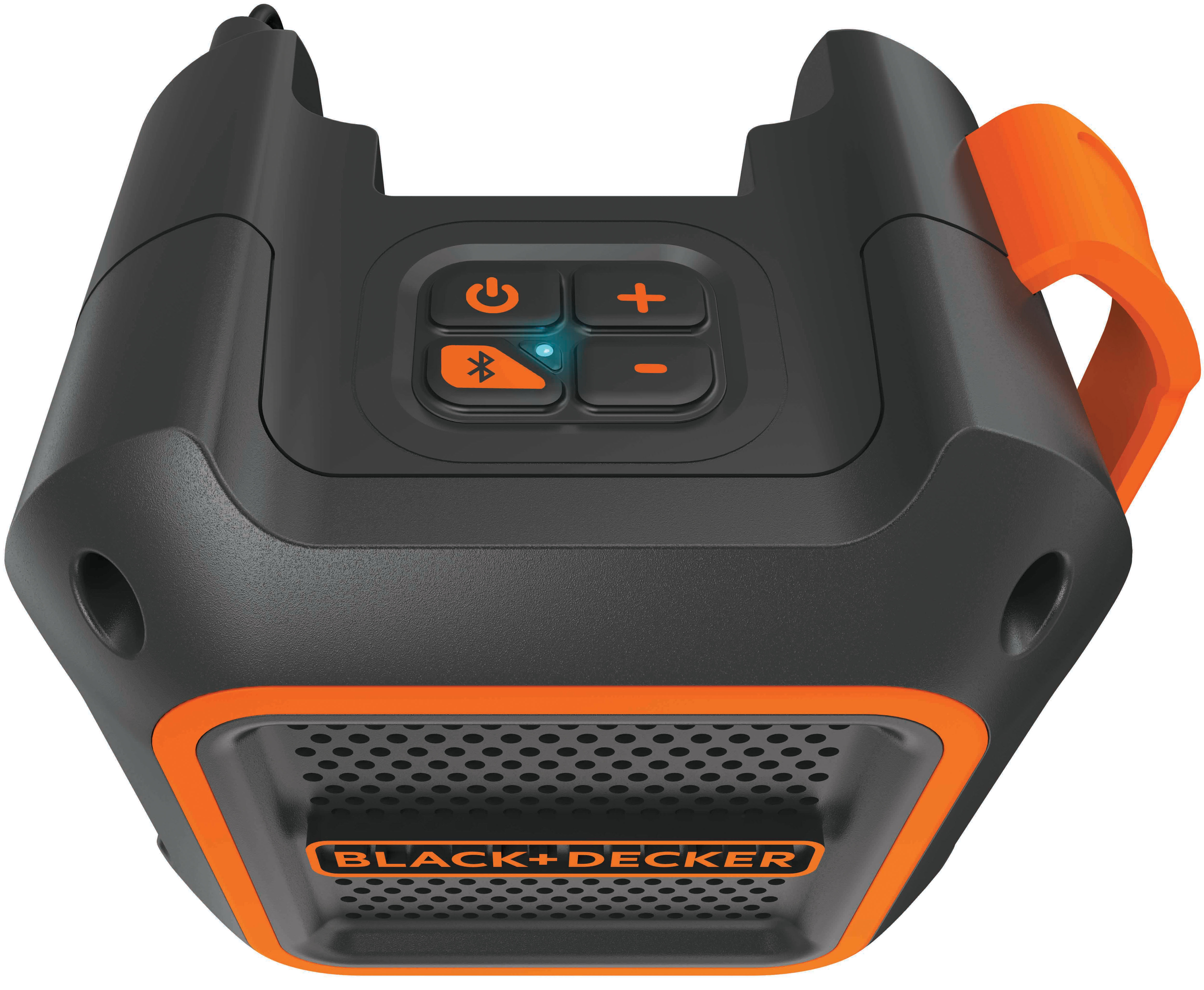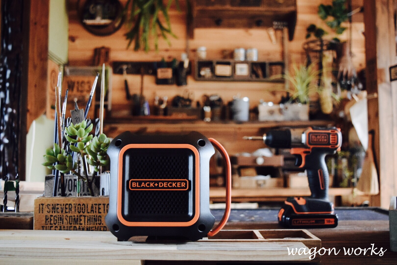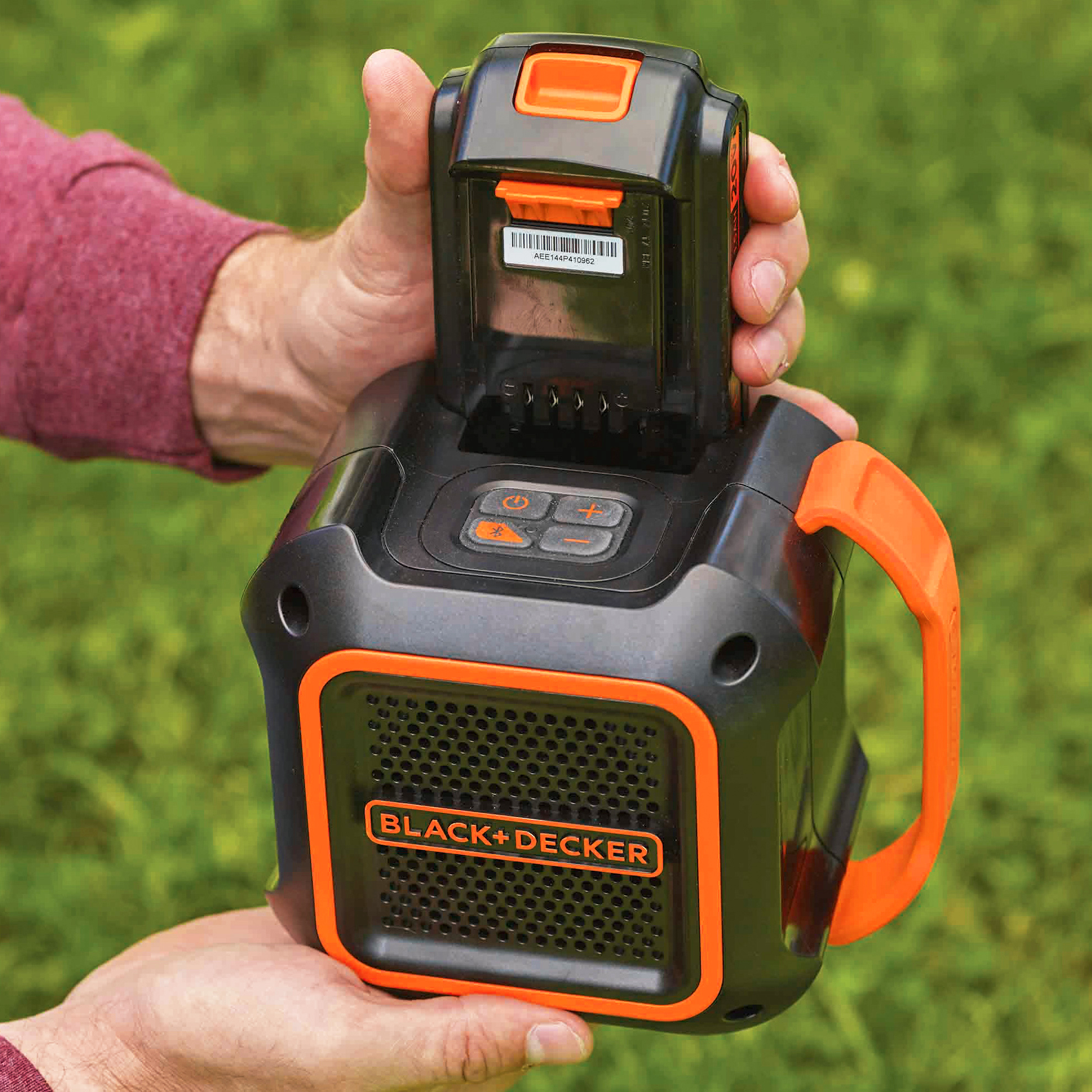 全長17cmとサイズもコンパクト、BLACK+DECKERらしい黒×オレンジのカラーリングもちょっと無骨でいい雰囲気。使用する18Vバッテリーは同社の電動工具や園芸用アイテムなど16機種共通に使えるバッテリー。工具を同社のアイテムでそろえればバッテリーを共有できるが、スピーカー用にまで共有できるというワケだ。