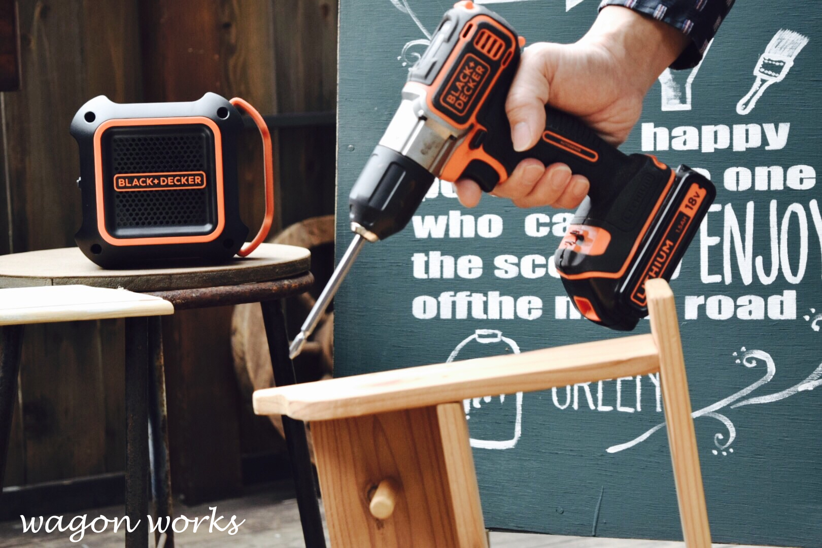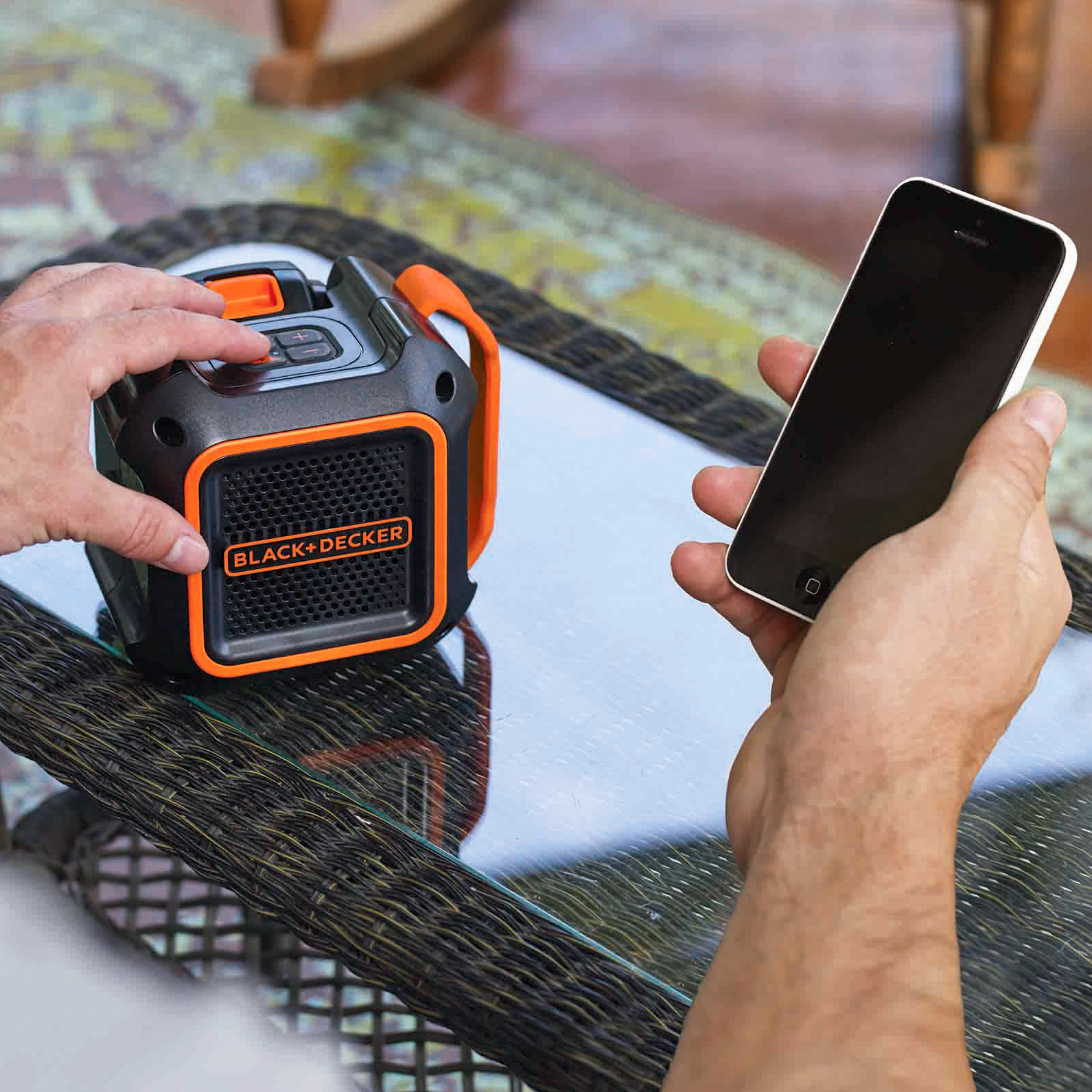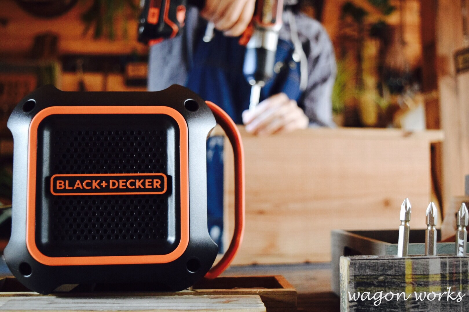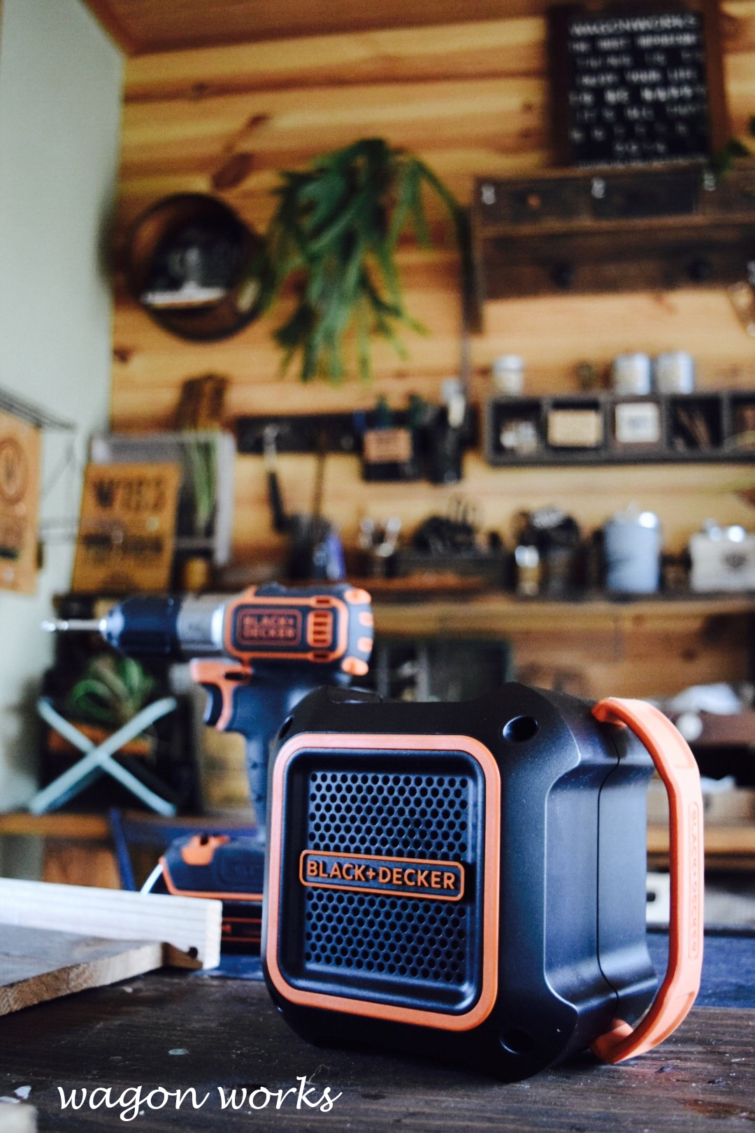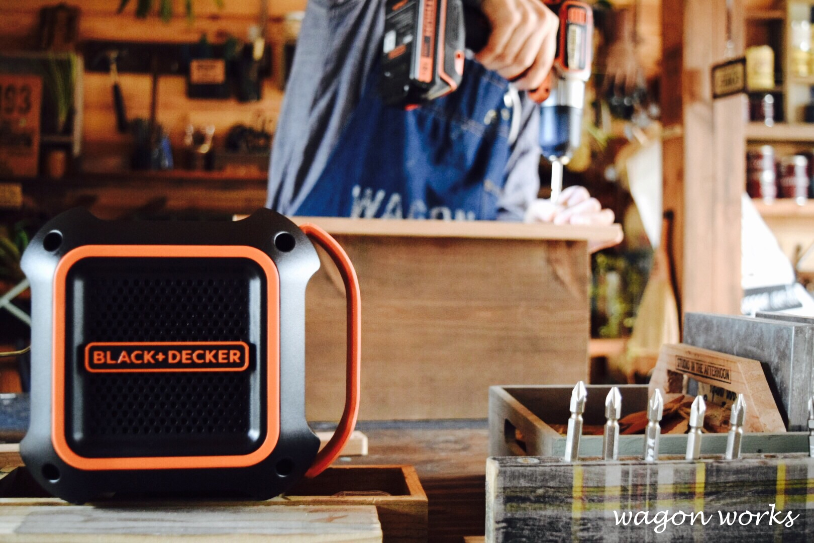 全長17cmとサイズもコンパクト、BLACK+DECKERらしい黒×オレンジのカラーリングもちょっと無骨でいい雰囲気。使用する18Vバッテリーは同社の電動工具や園芸用アイテムなど16機種共通に使えるバッテリー。工具を同社のアイテムでそろえればバッテリーを共有できるが、スピーカー用にまで共有できるというワケだ。
