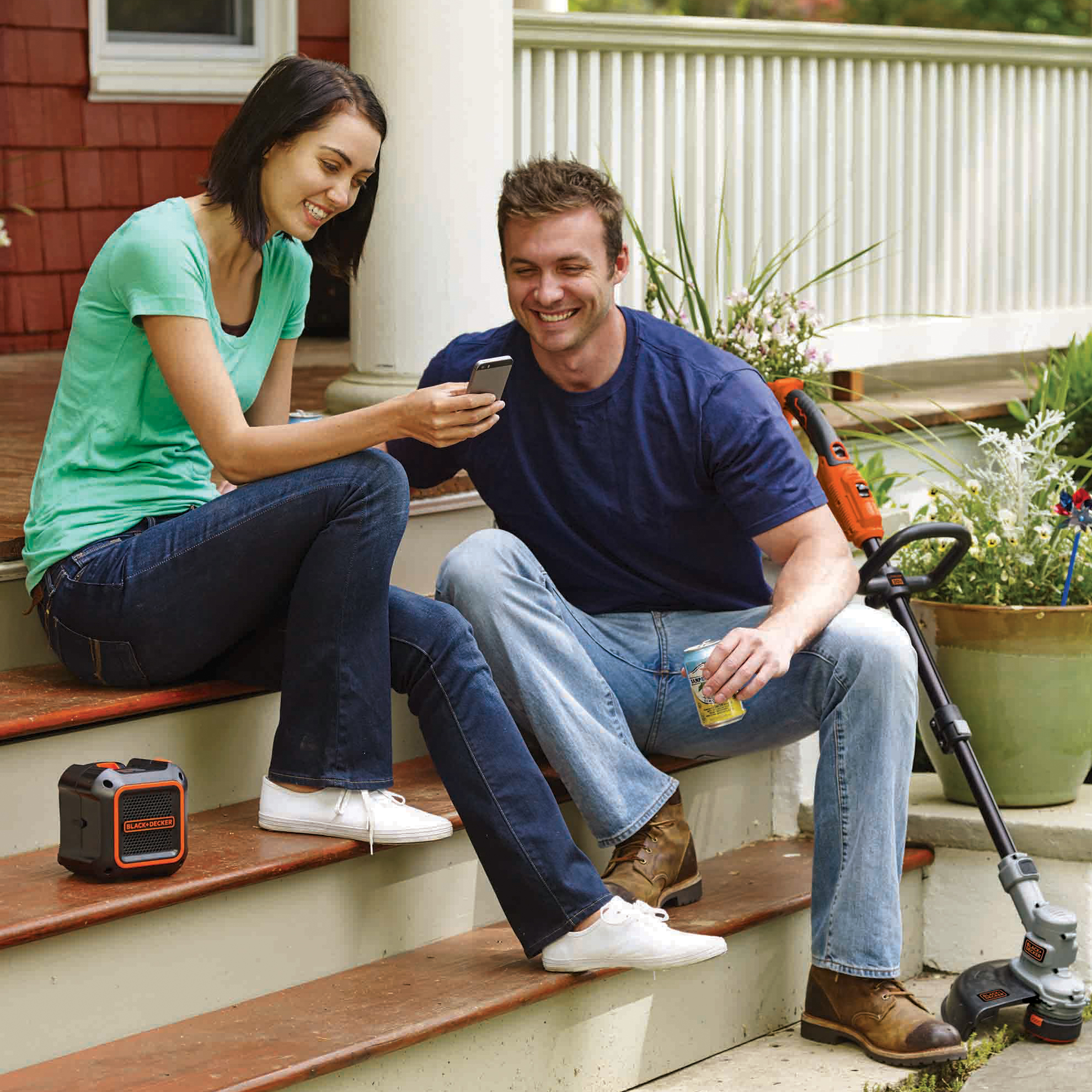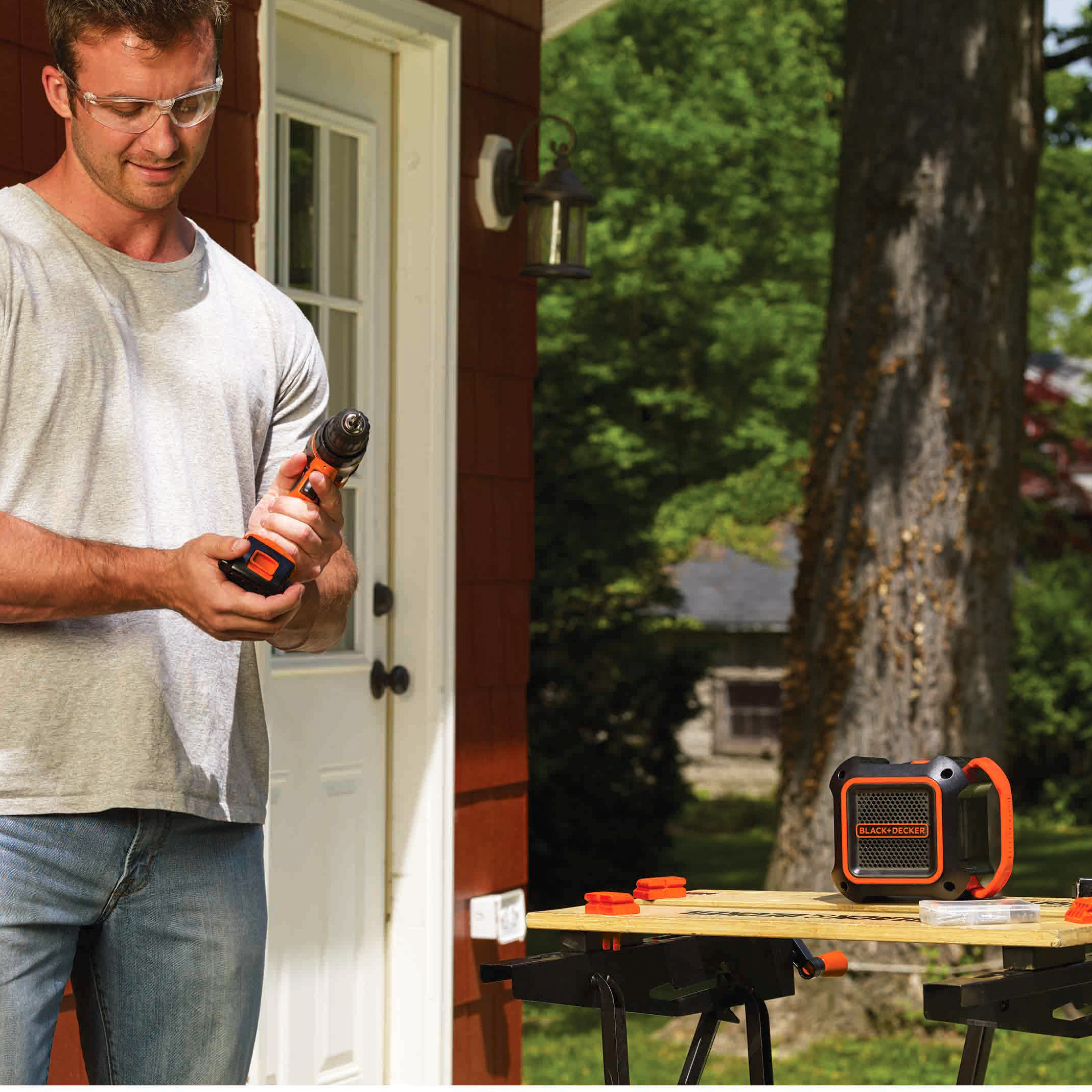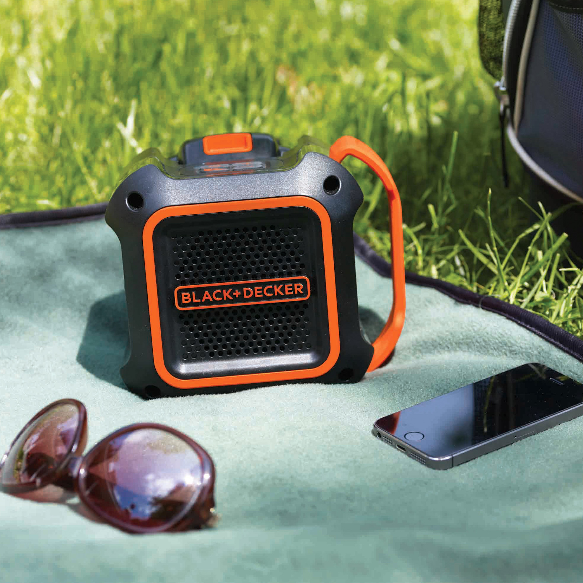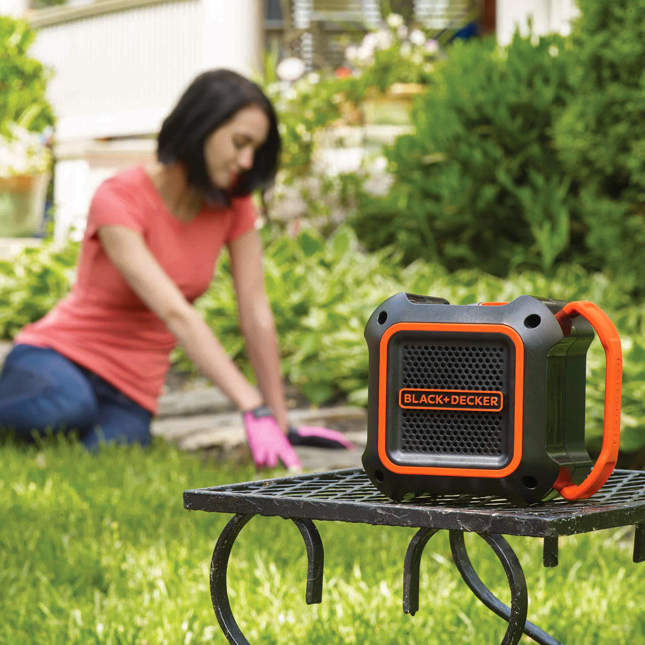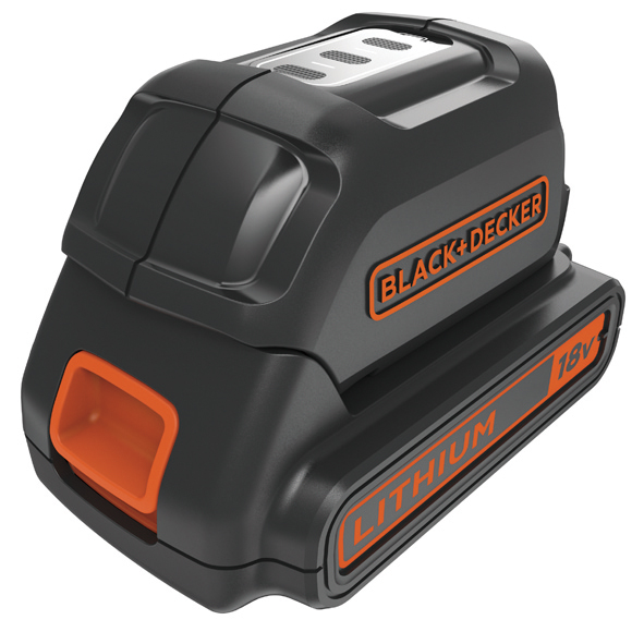 全長17cmとサイズもコンパクト、BLACK+DECKERらしい黒×オレンジのカラーリングもちょっと無骨でいい雰囲気。使用する18Vバッテリーは同社の電動工具や園芸用アイテムなど16機種共通に使えるバッテリー。工具を同社のアイテムでそろえればバッテリーを共有できるが、スピーカー用にまで共有できるというワケだ。