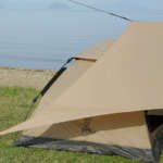 タープ前後に適度な開放感を演出しつつも周りの視線を上手に遮る、このバランスがまさに絶妙! さらに、タープ後部には取り外し可能なデイジーチェーンベルトが付属しているので、タープとテントとを適度に近づけてピンと張らせて設営できるようになっています。