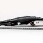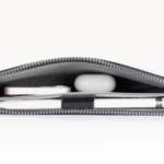 ポーチの内装は、レイヤー構造になっており、中の仕切りをあえて縫って留めないことで、ガジェットを入れた時に起こるポーチ内のたわみを防ぎ、スリムな形を常に維持できます。バッテリーやApple Pencil、アタッチメントなども収納するスペースが設けられているので、しっかり収納しておけば失くす心配もありません。