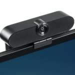 「400-CAM077」は、本体に広角カメラとマイク、それにスピーカーを内蔵した会議用Webカメラ。USBケーブル1本でかんたんに繋がるからセッティングも楽々。搭載するのは水平画角100度の広角レンズだから、複数メンバーが参加するWeb会議には最適な選択肢。カメラ本体は横方向に360度回転するので、見切れた参加者がいる場合も一時的に方向を変えることで対応できます。