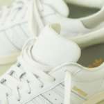 今回、別注モデルのポイントは大きく5つあります。ひとつ目はアッパーのソフトレザー。高級感のあるピュアホワイトカラーで、カジュアルなスタイルにはもちろん、上品なコーディネートにも好相性となっています。