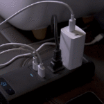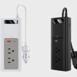 AC出力対応のコンバーターは大きく重いものが多いなか、こちらは17.3×6.5×3.6cm、重さ270gと軽くコンパクト。40cmというケーブル長も後部座席までぎりぎり届く絶妙な長さで、コンソールボックスの中に入れておいて必要な時に取り出してカーチャージャーと取り替える、といった使い方にはちょうどいいサイズ感です。安全面を配慮して、本体には過熱を防ぐ冷却ファンや、使用中の電圧をリアルタイムで確認できるディスプレイを搭載。ACコンセントには専用電源スイッチもついています。