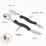 硬度が高く耐食性に優れた2CR13ステンレス鋼製で、ナイフ、フォーク、スプーンのほか、缶開け、栓抜き、螺旋栓抜きの機能も搭載。折り畳み時のサイズは115x38x32mm、重さは135gと、「Samicon マルチナイフプライヤー」同様軽量コンパクトな設計。