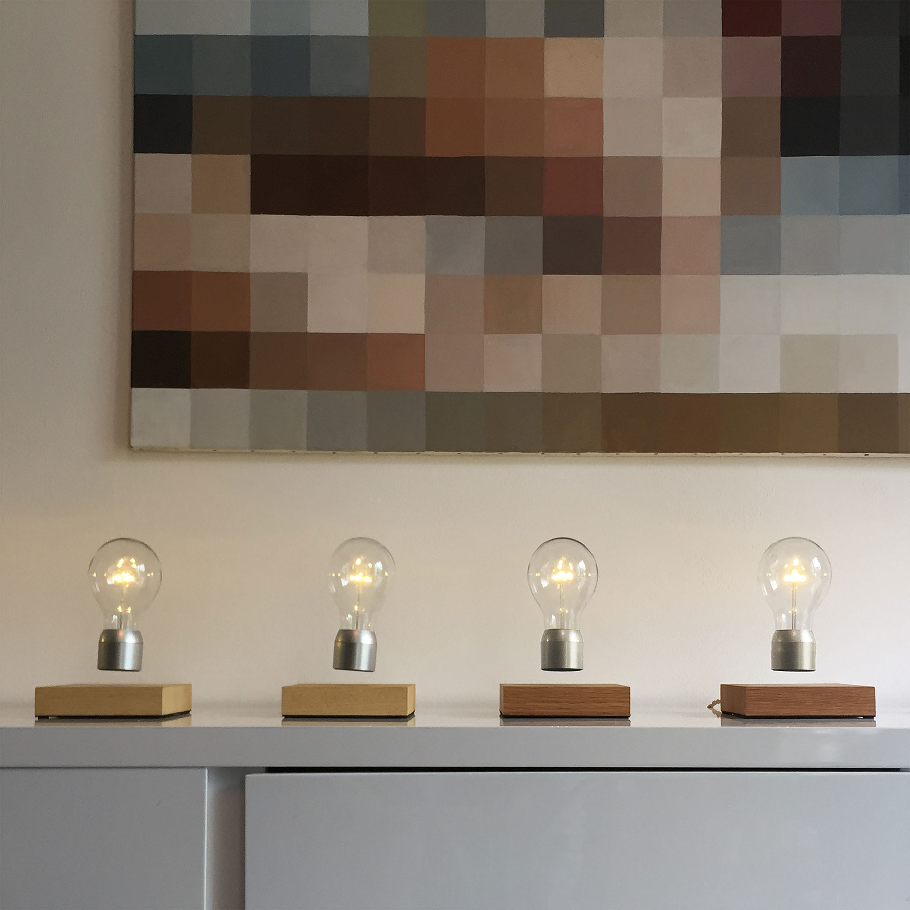 「FLYTE ライト」は、宙に浮いた状態でゆっくりと周りながら光り続けるLED照明。しかも照明スイッチのオンオフは木製の台に手でタップするだけという魔法のようなテーブルランプだ。