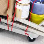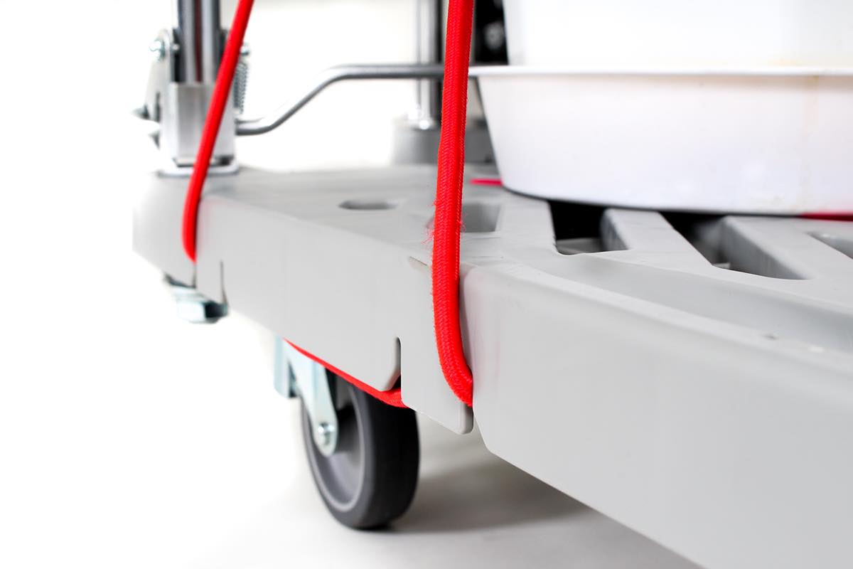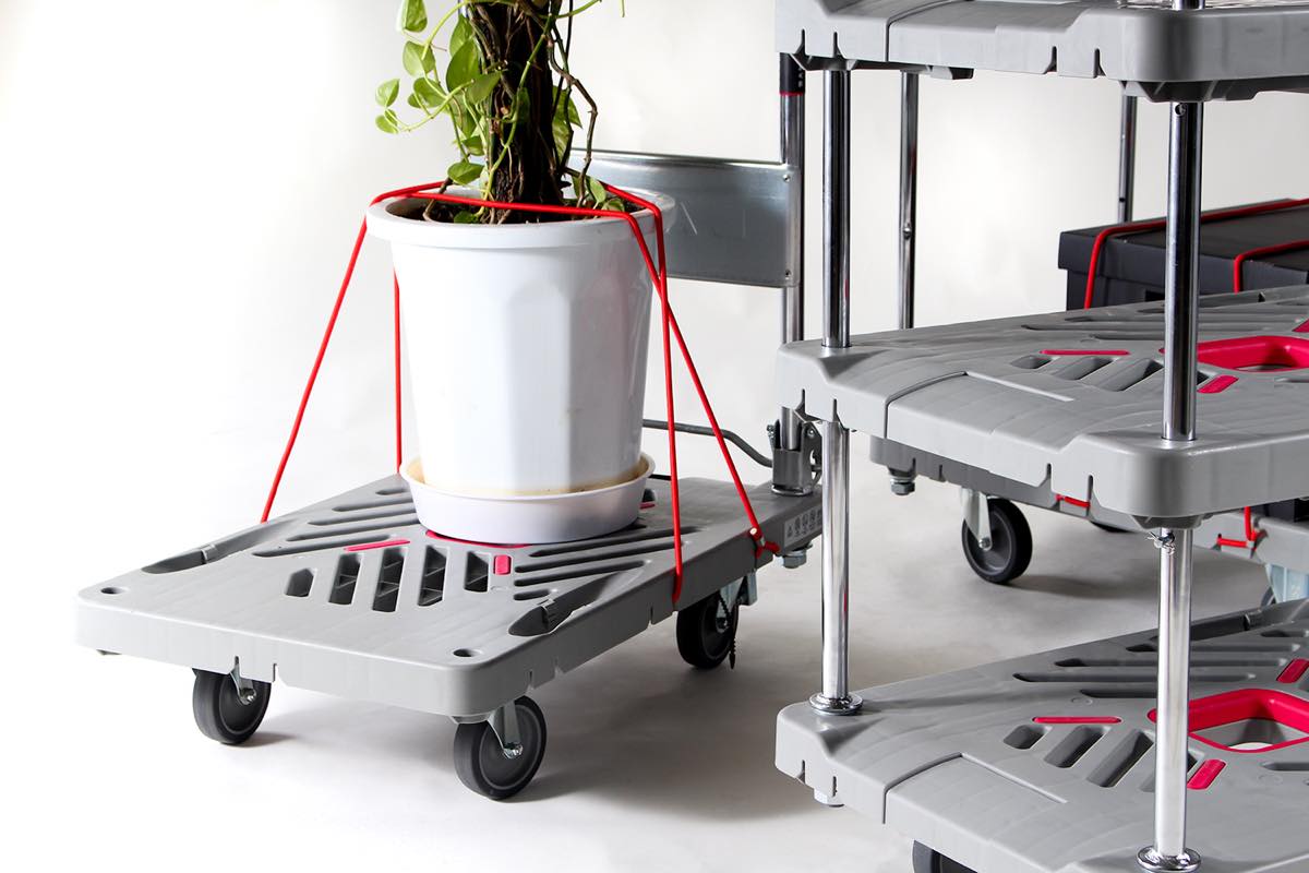 じつは台車を買う際に同時購入されることの多いアイテムのひとつが、フック付きのゴム紐なのだそう。載せた荷物をぎゅぎゅっと固定できるのは確かに便利だけど、この手のゴム紐って、大抵両端にカギ状の金属フックがついていますよね。良かれと思っての工夫でしょうが、あれって取り付け場所によっては使いこなすのが思いのほか難しいし、さらに運搬中に何かの拍子に外れてしまえば、思いがけない事故を招くことだってあります。
