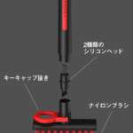 147×80×28mmというコンパクトサイズのシンプルなナイロンブラシですが、柄の部分には小さな2種類のシリコンヘッドを内蔵し、さらに絵の根元部分にキーキャップ抜きも搭載した “4in1” なアイテムです。