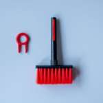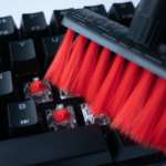 さらに時間があるときには、キーキャップをひとつひとつ外して、キーの下のスペースのブラシ掃除を。柄の根元から取り外した赤いキーキャップ抜きでキートップを挟み、上に引き抜いて外します。