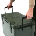 側面には、優しい手触りのウレタンハンドルが付きますが、中身がたっぷり入って持ち上げにくい時のために、直接手を掛けて持ち運べるグリップがついているのもうれしい配慮。また、ファミリーキャンプでの使用を考えて、握る力の弱い小さな子どももラクに開けられる上向きバックルが採用されています。金属などの硬いパーツを使っていないから、挟んでケガしにくい点も安心です。