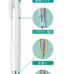 また、1本で黒・赤2色のボールペンとシャープペンが使える多機能ペンでありながら、スリムなボディサイズに仕上げているのもポイント。従来の単色ボールペンのブレンと同サイズで持ち運びやすくなっています。ボールペンは、滑らかで書きやすいエマルジョンインクを使用(0.5mmと0.7mmに対応)。シャープペンの芯径は0.5mmです。