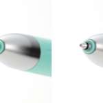 これを多機能ペンで実現するため、「ブレン2+S」はシャープメカを細くし、ボールペンとペン先のサイズを同じにしています。これまでの多機能ペンは、ボールペンとシャープペンのペン先の太さが異なるため、ペン先と先端孔の間に隙間が生じ、ブレの原因となっていたのです。先端孔とペン先の隙間を小さくし、また先端に振動の制御に効果がある材質を採用することで、シャープペンとボールペンどちらの中芯もホールドし、ペン先のブレを防いでいます。