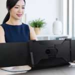 ジャバラ状に畳まれた本体をパタンパタンと開くと、左右それぞれ1枚ずつ液晶画面が現れます。上部のブラケットを手持ちのパソコンの上端にかぶせて背面スタンドを立て、PC本体とUSB Type-C、もしくはMini-HDMI経由でつないだらセッティングは完了。大きな液晶ディスプレイを用意しなくても、省スペースでマルチディスプレイが完成できるというわけです。