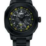 シックにまとめた意匠の中でひときわ目を惹くのが、フェンディのアイコニックでもあるイエローカラーのアクセント。フェイスのアウターリングの24時間目盛とGMT針の先端に付いた飛行機モチーフのインジケーターに配したイエローが、ブランドのアイデンティティを明瞭に主張します。