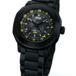 今回発表された「Selleria Man」新モデルは、フェイスやケース、時分秒針を黒一色で統一したシャープなオールブラックモデル。一見シンプルなデザインですが、2種類の時刻表示を可能にするGMT機能に合わせて、フェイス中央には世界地図をさりげなくレイアウトし、3時位置には日付表示窓を備えます。インデックスと針先端には、視認性を確保するためホワイトを配し、アワーインデックスには蛍光塗料を施しています。