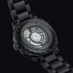 バンド部分には、ケースと同じくブラックカラーのステンレススチール製ブレスレットを合わせることで統一感を演出。ケースバックを回転させるだけで簡単にバンド交換できる独自ストラップシステムを採用しているので、シーンに合わせてブレスレットからストラップへと交換できるようになっています。