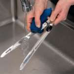 また、本体は自立可能。作業中でも鋭利なブレードがテーブルに触れる心配がありません。“ブレードリリースボタン”を押せばワンタッチでブレードの取り外しができるため、お手入れも簡単。使わないときには付属のカバーに収納できるので、安全に保管できます。