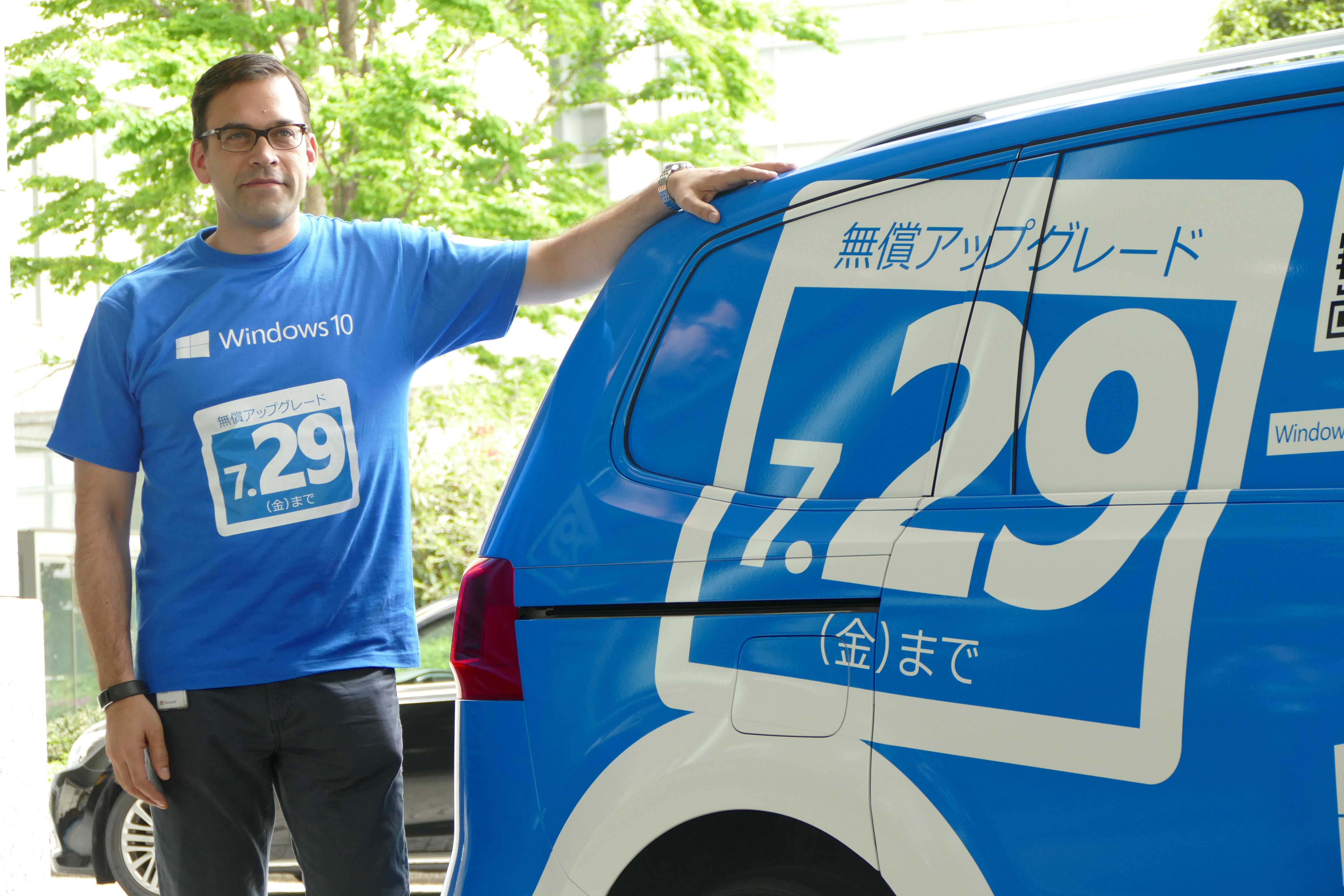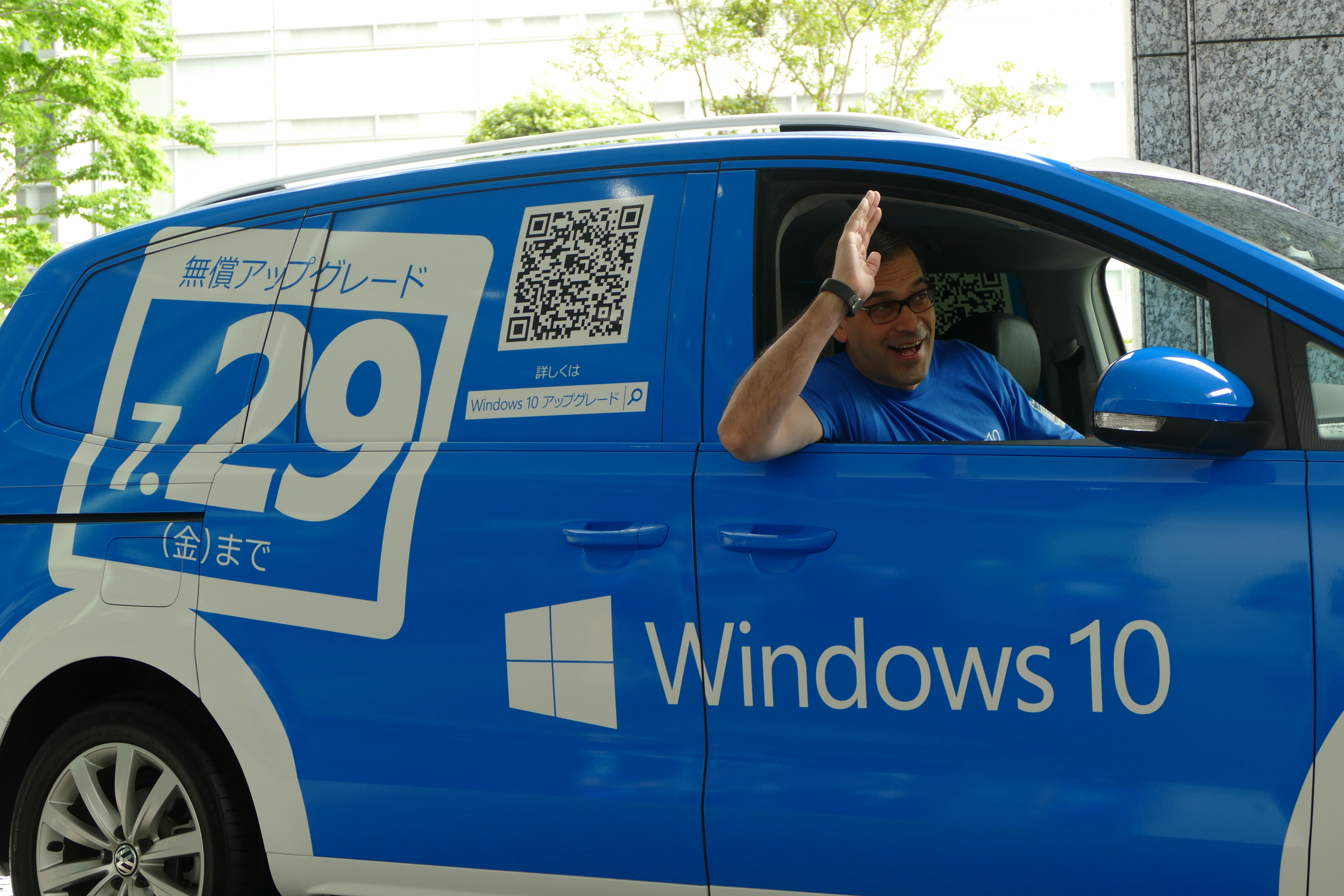 Windows 10の無償アップグレードが7月29日で終了することを告知するキャラバンカー。全国10都市以上で体験ブースを展開する予定だ