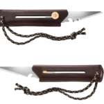 「替刃式ブッシュクラフトナイフ BK1 レザー」に使われているのは、天然皮革 “牛ヌメ革” 。ヌメ革は表面仕上げを行わない自然な風合いが特徴で、滑らかな触り心地は手にしっくり馴染みます。