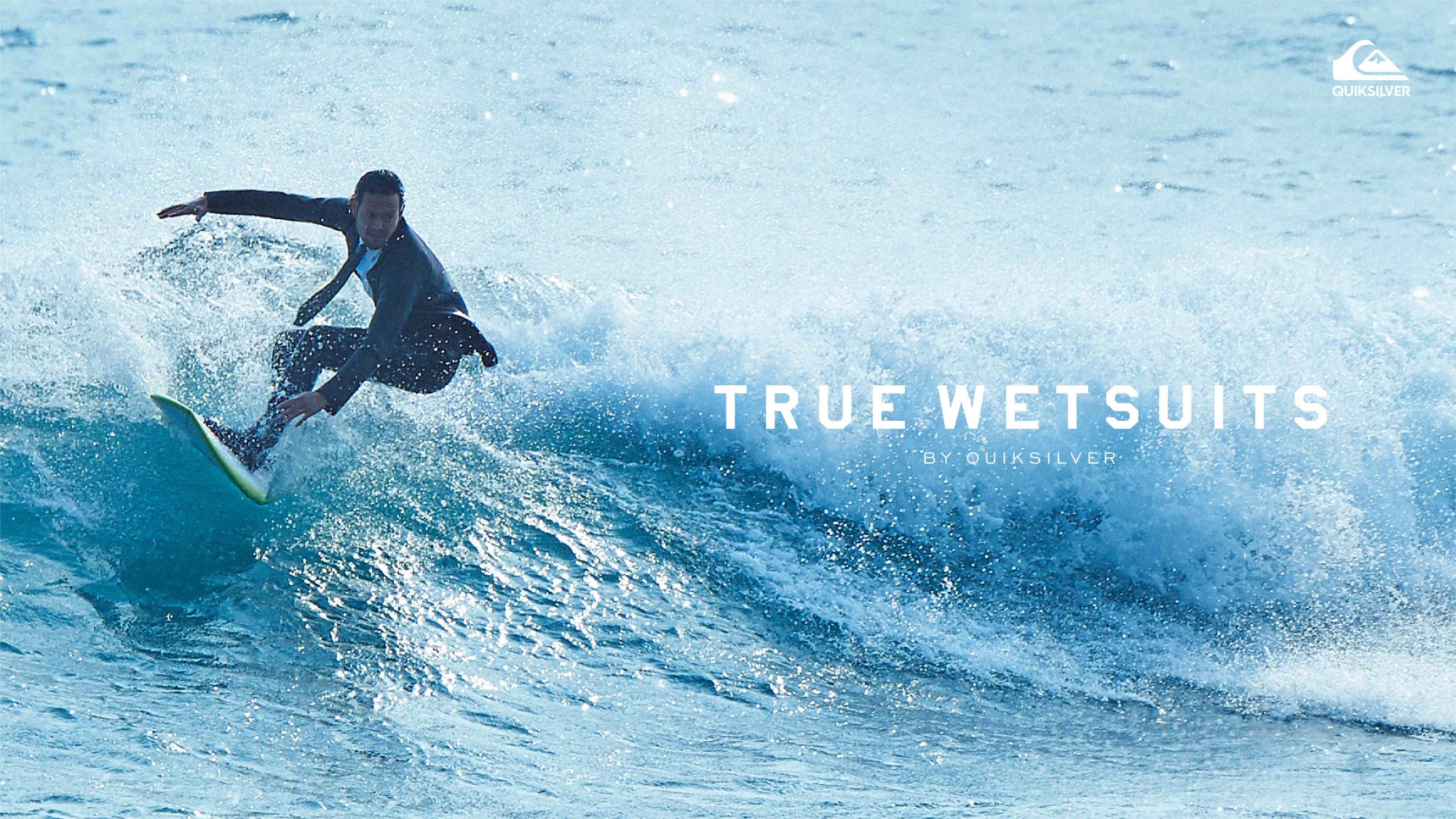 見た目はスーツ+ネクタイの仕事仕様そのままだが、なんと正真正銘のウェットスーツである。これ、ウケ狙いやなんちゃってアイテムでもなんでもなく、世界中のサーファーから支持されるあのクイックシルバーが作った、あらゆるウォータースポーツを楽しめるウェットスーツであり、さらにはスポーツ後のビジネスシーンでも使えるスーツでもある、という代物。