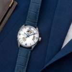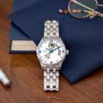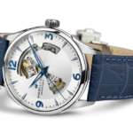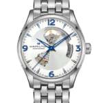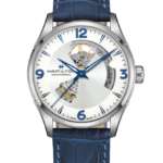 この春登場の新色では、光沢のあるシルバーダイヤルに合わせて、楔形のインデックスとアラビア数字、時分秒針にメタリックブルーを配色。セミスケルトンになったダイヤル中央からは、 80時間のパワーリザーブを誇るハミルトン専用ムーブメント“H-10”の営みを覗かせますが、外周にレイアウトしたマットホワイトが全体の印象を清潔なものにまとめています。