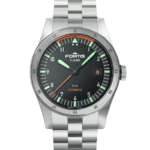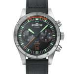 スイス・ケニッシ社による70時間パワーリザーブを誇るマニュファクチュールキャリバー“WERK13”を搭載しています。24時間式のジャンピングアワーと両方向回転ベゼルを備え、第二時間帯と第三時間帯を表示。ところどころに使われている鮮やかなオレンジ色がデザインのアクセントになっています。