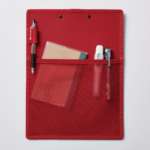 スタンダードな「オールイン クリップボード」は、ボードの背面に伸縮性のある「メッシュポケット」と「ペンホルダー」を装備。メッシュポケットは厚さ約20mmまでの小物であれば収納可能になっているため、例えばペンや電卓などの小物、小型のメモ帳、はさみ、カッター、マスキングテープ類なども運ぶことができます。収納物で厚みが変化する、薄型のシンプルなデザインです。