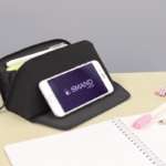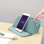 大容量サイズの「SMAND」最大の特徴は、前面をパカッと開くとスマホスタンドとしても使えることです。開いた部分には滑り止めが付いているので、好みの角度でスマホを立て掛けられます。これなら、わざわざスマホスタンドを用意しなくても、見やすい角度でスマホを置いておけますね。
