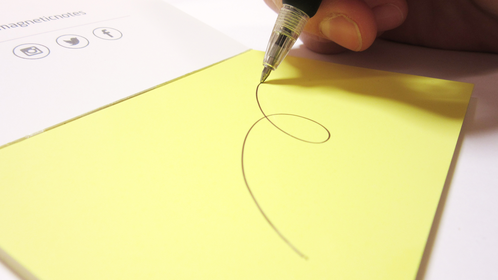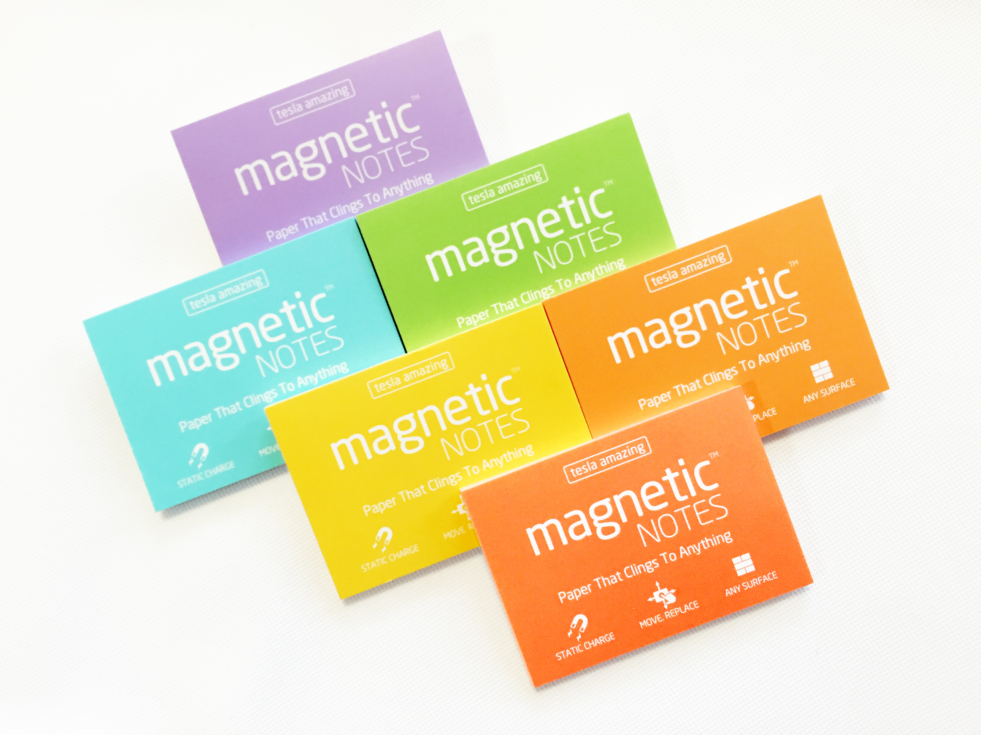 「マグネティックノート」は、見た目は100枚つづりの普通のフセン。その一枚一枚に粘着面はありませんが、両面どちらとも、プラスチックやガラスのほか、レンガ、金属、コルク、石材、革、紙、布地など、どんな素材にもぴたっと吸い寄せられるように貼りつくのです!