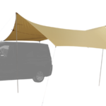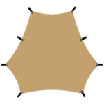 生地の形状は変則的な六角形にデザインされており、各頂点と最も長い辺の中間地点にグロメット&ループを配置。タープの広げ方にさまざまなアレンジを加えて設置できます。