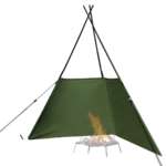 大きなポイントは、自立可能なティピー型であるということ。これまでの焚き火用風防といえば2〜3本のポールにスクリーンを渡してペグダウンするタイプが多く、いったん設置してしまうと移動や角度調整が面倒、という欠点がありました。